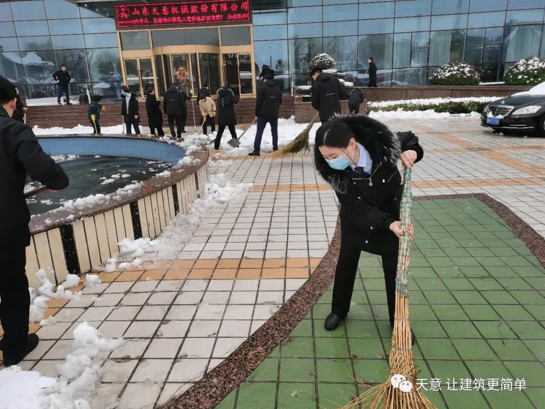 大雪悄然而至,一觉起来,窗外已是银装素裹。然而大雪的降临也给大家的出行带来诸多不便,公司大门口、办公楼前的道路都被皑皑白雪覆盖。早晨上班前,公司总经理刘海龙、营销总监郭川东带领公司员工拿起扫帚铁锨,满怀激情,投入除雪当中。整个除雪作业过程井然有序,热火朝天,干劲十足,大家不惧寒冷,不怕手冻。铁锨和地面的碰击声、扫帚清扫雪花的刷刷声,不一会儿办公楼前的积雪已踪影全无,所到之处,雪没了,路干净了,挂满枝头的冰凌随风婆娑起舞,点头称赞,大家的心中更是无比的欣慰,虽然冻红了脸、累出了汗,但累并快乐着。